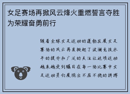 随着全球女足运动的蓬勃发展,女足赛场的风云再度掀起了波澜,竞技水平的提升和广泛的关注让这项运动越来越受到瞩目。在每一场比赛中,女足运动员们展现出不屈不挠的拼搏精神和坚定的信念。为了争夺胜利、荣耀和尊严...