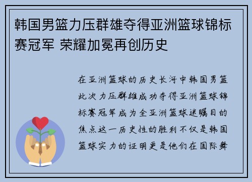 在亚洲篮球的历史长河中,韩国男篮此次力压群雄、成功夺得亚洲篮球锦标赛冠军,成为全亚洲篮球迷瞩目的焦点。这一历史性的胜利不仅是韩国篮球实力的证明,更是他们在国际舞台上深厚篮球底蕴的彰显。从阵容的精良配置...